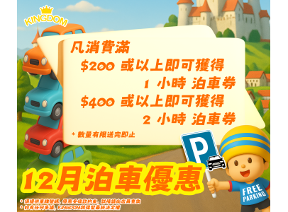 KINGDOM December Parking Offers🎁 1) Spend $200 or more and receive a free 1-hour parking voucher at LINK Kin Sang Car Park Parking Lot. 2) Spend $400 or more and receive two free 1-hour parking ...